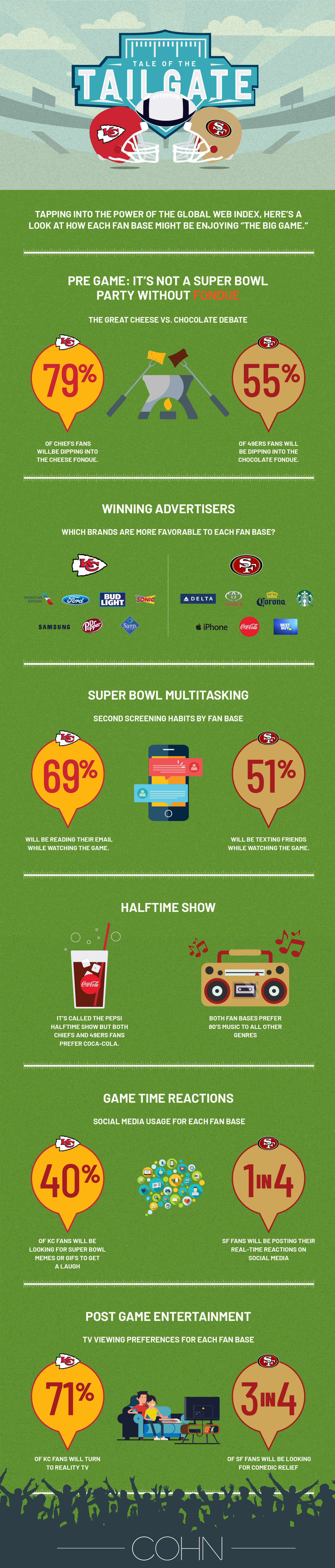 We aren’t football experts—we’re brand and marketing experts. So rather than dissect the gameplans of each football team, the COHN strategy team decided to use our exclusive data and insights tools to examine the fan bases of each team. Tapping into the power of the Global Web Index, we created custom audience profiles to get to know each fan base intimately.
